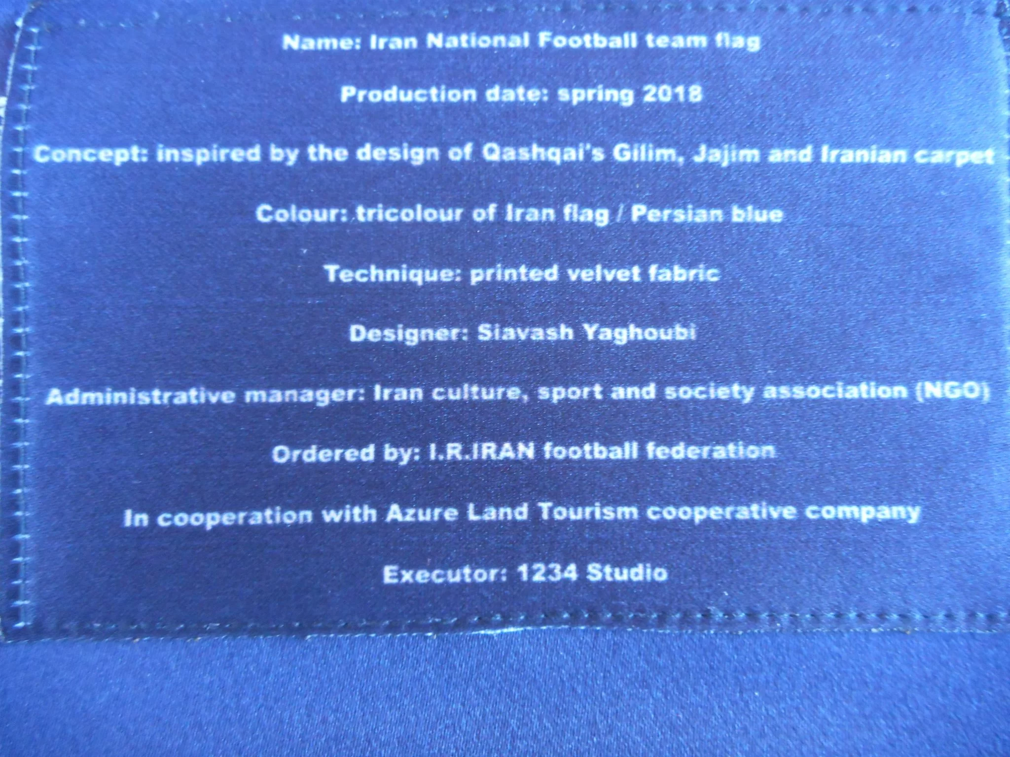 IRAN F.A.: Attualmente, ritengo che il fantasioso gagliardetto dell’Iran vanti un curioso record del dettaglio. Mai, infatti, mi era capitato di vedere una così minuziosa sintesi riportata nell’etichetta apposta nel retro del gagliardetto. In essa vengono riepilogate: il nome del prodotto, il mese e l’anno di produzione, il nominativo del committente (la Federazione Calcistica Iraniana), il dettaglio del colore, la descrizione del motivo principale che adorna la fronte del gagliardetto, il nome del designer che lo ha realizzato nonché la Ditta produttrice. Impressionante davvero.
