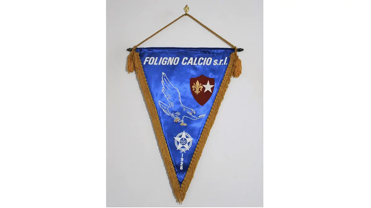 Il Foligno si costituisce nel 1928 e nella sua storia annovera venticinque partecipazioni a vari campionati professionistici. L’azzurro, insieme al bianco, sono i suoi colori mentre il falco è il simbolo della società e da esso discende il soprannome “falchetti” dato alla squadra dai tifosi. Circa i gagliardetti, nei primi anni settanta, erano su sfondo azzurro e stemma ad ancile contenente, in alto, la sigla della squadra (A.S.F.) nonché croce e giglio, emblemi tratti dallo stemma cittadino a rappresentare la popolazione (giglio) e l’insegna del Capitano del Popolo (croce).