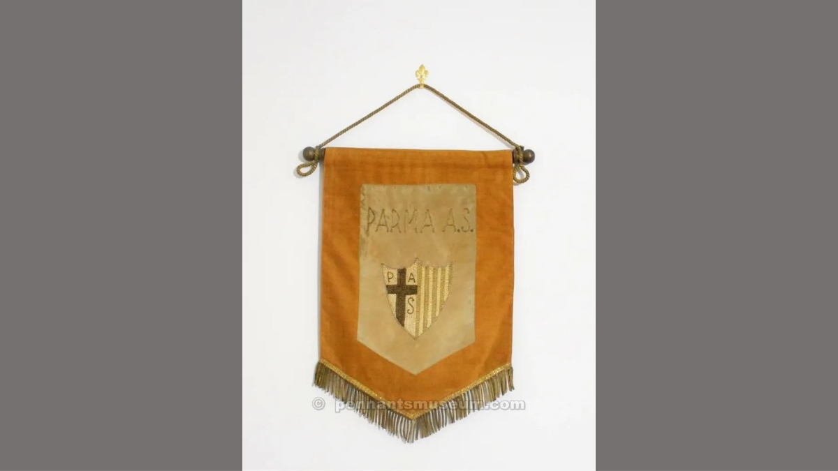 I gagliardetti dei parmensi negli anni Cinquanta riportavano la denominazione A.S. Parma insieme ad uno scudo svizzero ripartito con una sezione che riportava la classica croce nera in campo bianco mentre nell’altra porzione erano presenti i colori giallo e blu tratti dallo stemma civico.