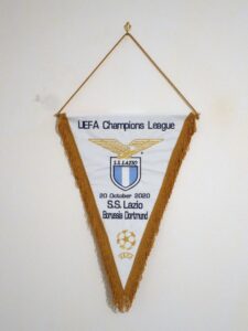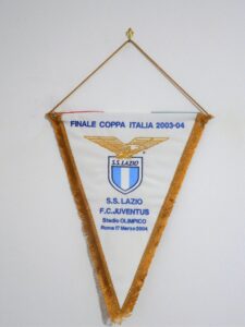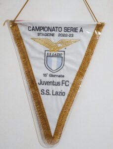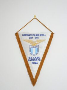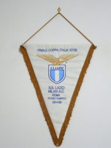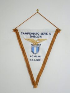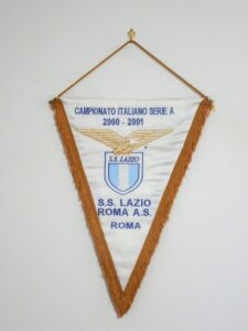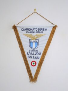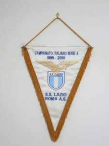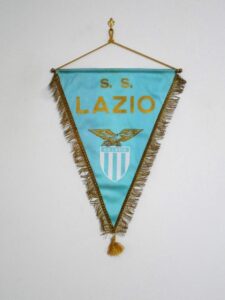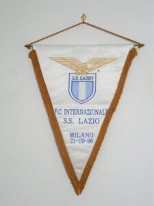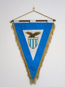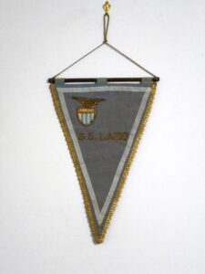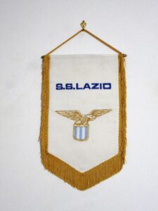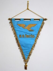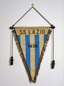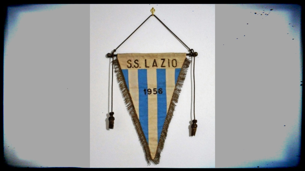 Nel dettaglio, nel 1956 venivano utilizzati gagliardetti a righe verticali bianche e celesti, con la denominazione S.S. Lazio con il ricamo dell’annata.