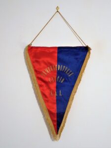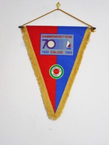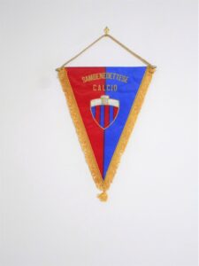 In merito ai gagliardetti negli anni settanta riportavano, su uno sfondo costituito dai colori rosso e blu, una stemma a scudo con una fascia trasversale anch’essa in rossoblù. Nei primi anni Ottanta sui gagliardetti non ci sono stemmi. A partire dalla seconda metà c’è l’introduzione di uno scudo su cui compare un simbolo della città, presente anche nell’araldica cittadina, la cosiddetta Torre dei Gualtieri.