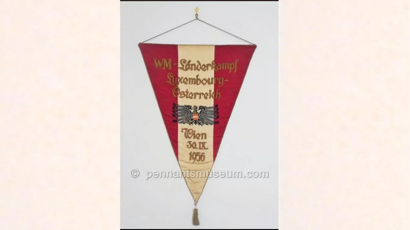 Lo splendido esemplare odierno testimonia la bellezza dei gagliardetti che viene espressa negli esemplari prodotti sia per la nazionale Austriaca sia per i club nel periodo che parte dagli anni Venti fino a lambire gli anni Sessanta. Nel dettaglio il valore aggiunto del gagliardetto di cui trattasi, a parte la cura nei dettagli degli accessori (cordino, pendaglio, ecc.) è nel ricamo centrale dell’aquila, ripreso dall’araldica nazionale. In questo caso l’aquila ad una festaraffigura la rottura con l’araldo del Regno Austro – Ungarico, in cui era presente un’aquila bicefala, e riporta negli artigli del rapace una falce ed un martello simboli introdotti a partire dal 1921 ed atti a identificare la pari uguaglianza tra le classi sociali.