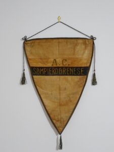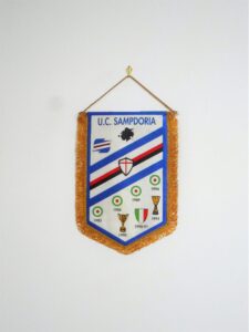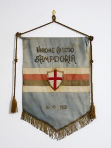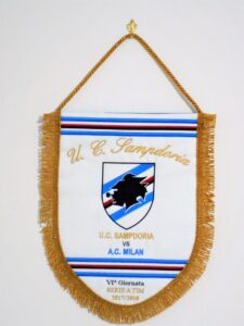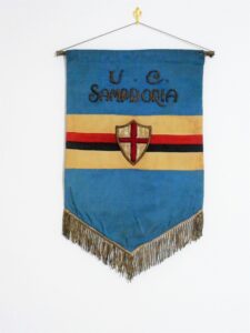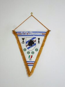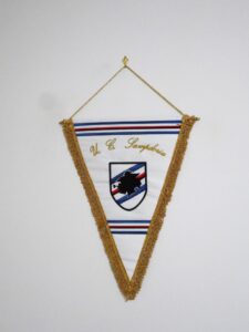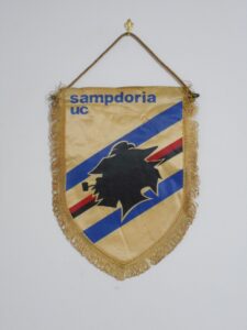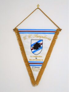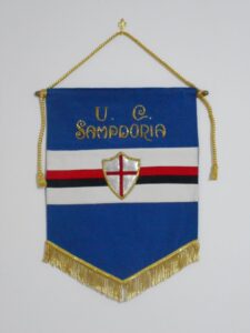Nel dettaglio, i gagliardetti dei doriani nel 1950 riportavano la denominazione societaria apposta su di uno sfondo blucerchiato nonché la data relativa all’incontro.