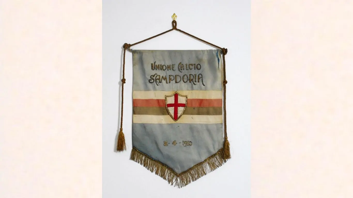 Nel dettaglio, i gagliardetti dei doriani nel 1950 riportavano la denominazione societaria apposta su di uno sfondo blucerchiato nonché la data relativa all’incontro.