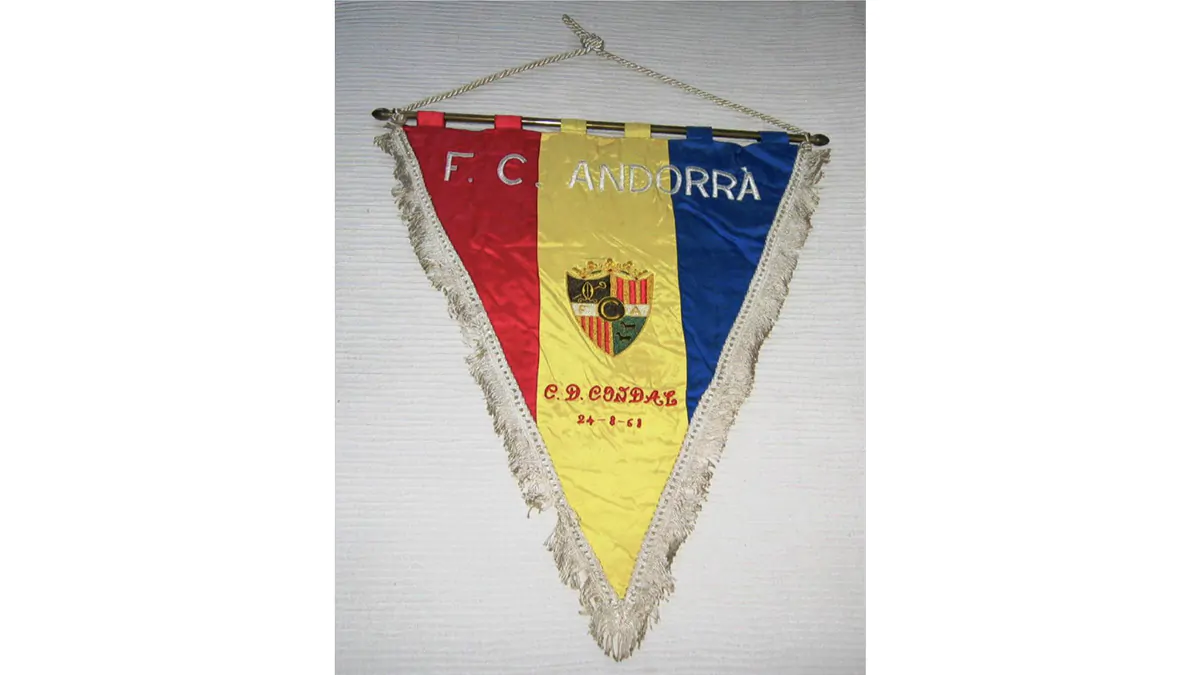 Circa il gagliardetto, per finiture ed altri dettagli, ricorda gli esemplari prodotti per alcune squadre catalane. Potrebbe sembrare che il lavoro l’abbia fatto un’azienda della Catalogna. Si riferisce ad un incontro che il club disputò contro il Club Deportivo Condal, squadra di un quartiere di Barcellona, nel 1968 ed ha una curiosità: risulta invertito l’ordine dei colori della bandiera del Principato poiché viene anteposto, sul lato sinistro, il rosso al blu.