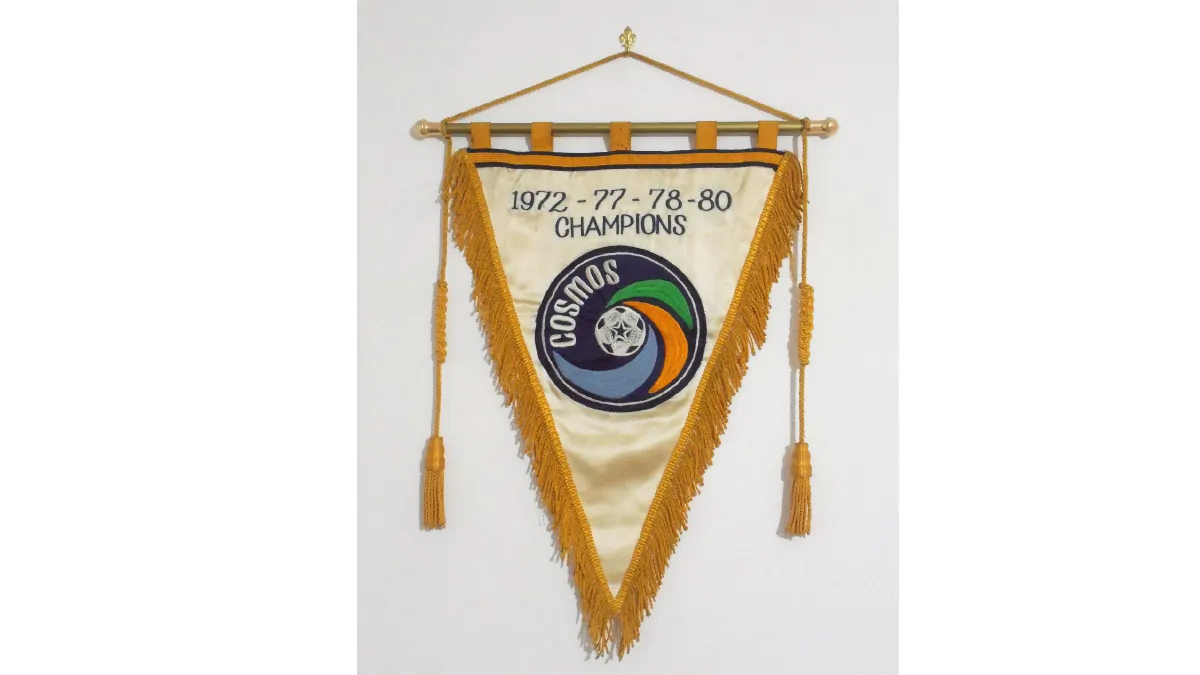 Anche la scelta dei colori non fu casuale. Venne basata sulla precisa strategia di assoldare nelle file del Cosmos il più grande calciatore al mondo dell’epoca, Pelé. Da qui la scelta del verde oro colori presenti nelle insegne brasiliane ed anche richiamata nella parte superiore del gagliardetto in uso negli anni Ottanta. Un bell’esemplare realizzato con standard abbastanza inusuali rispetto a quelli utilizzati da altre squadre statunitensi in quel periodo. Ricamato con lo stemma del club al centro e l’indicazione delle annate dei trionfi nella North American Soccer League – NASL, il gagliardetto veniva “aggiornato” ad ogni vittoria conseguita nel campionato statunitense. Questo esemplare è stato sicuramente in uso tra il 1980 (anno del quarto titolo) ed il 1982. In quell’anno il Cosmos si aggiudicò il suo ultimo titolo nazionale.