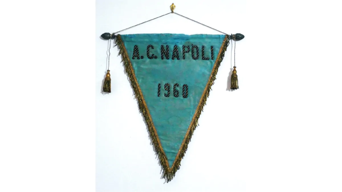 Stagione davvero infausta la 1960-61 per il Napoli culminata con la retrocessione amara in serie B. Nel corso del campionato sulla panchina partenopea si erano succeduti Amedeo Amadei, affiancato da Renato Cesarini quale Direttore Tecnico e poi Attila Sallustro nelle ultime due partite di campionato quando praticamente i giochi, per la retrocessione era già fatti. In quell’annata, la squadra partenopea, utilizzò un gagliardetto che, già dalla fine degli anni Cinquanta, era in dotazione della prima squadra. Un esemplare privo di stemma e con il ricamo in canottiglia della denominazione societaria e dell’annata.