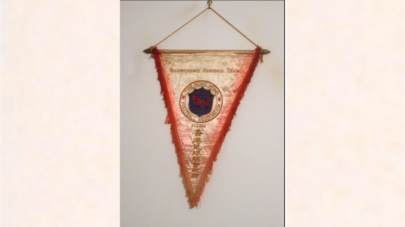 Un gagliardetto davvero desueto se comparato con la tipologia in uso nei Paesi del Sud Est asiatico. Non comune infatti trovare un gagliardetto ricamato interamente a mano poiché ben altre manifatture erano preferite. Anche la ricchezza dei dettagli, lo stemma gli ideogrammi posti al di sotto del simbolo della federazione di Hong Kong testimoniano la cura ed il fascino dell’esemplare a cui fa difetto esclusivamente l’alone rosso sicuramente derivante dalla decolorazione delle frange che ha invaso anche il tessuto del gagliardetto macchiandolo. Della circostanza in cui lo utilizzarono, si conosce poco, se non quanto riportato sul sito del Valenciennes Football Club che ricevette in omaggio l’esemplare.