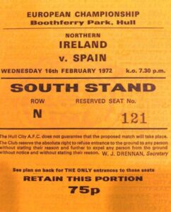Nel caso di Irlanda del Nord-Spagna, quando l’incontro in questione fu finalmente giocato, nel febbraio del 1972, la sede del match fu appunto in Inghilterra, nello stadio di Hull. La scelta del campo dipese dal fatto che Terry Neill, che in quegli anni era giocatore e allenatore dell’Irlanda del Nord era anche allenatore/giocatore del club di Hull.