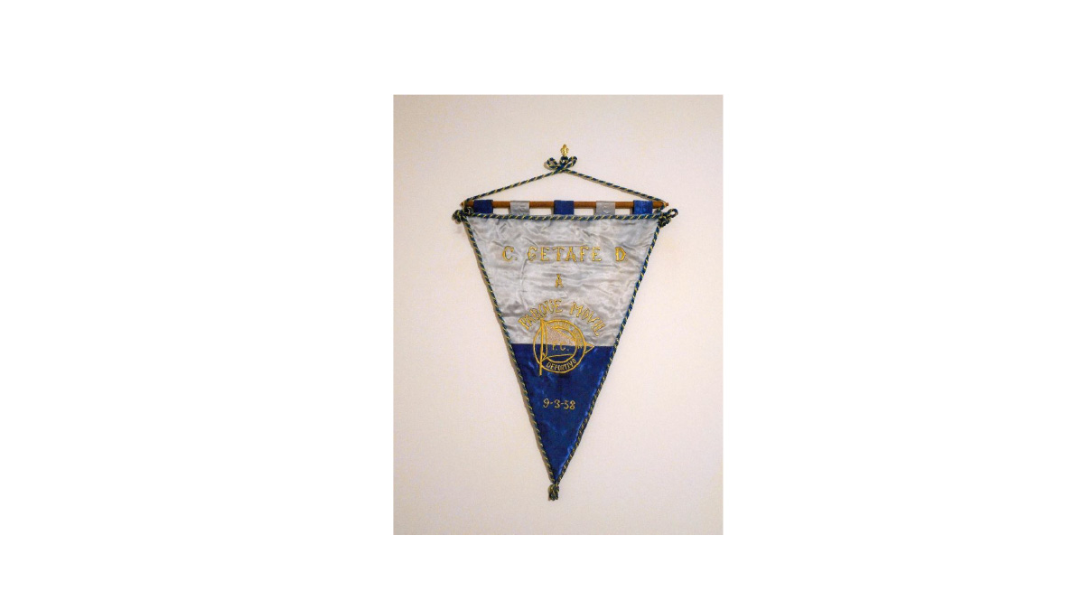 Prima di questo stemma, tuttavia, questa società, ai suoi albori, ha preferito esporre una simbologia meno legata alla città come quella che veniva apposta sui gagliardetti realizzati alla fine degli anni Cinquanta quando l’allora Club Deportivo Getafe (la prima denominazione assunta dalla squadra) disputava i campionati corrispondenti alla nostra serie D. Infatti nel gagliardetto bianco e azzurro oggi presentato compare quale emblema una bandiera all’interno di un cerchio con qualche analogia alle insegne utilizzate da altre squadre spagnole come l’Alavés ed il Deportivo La Coruña, sebbene in epoche diverse.