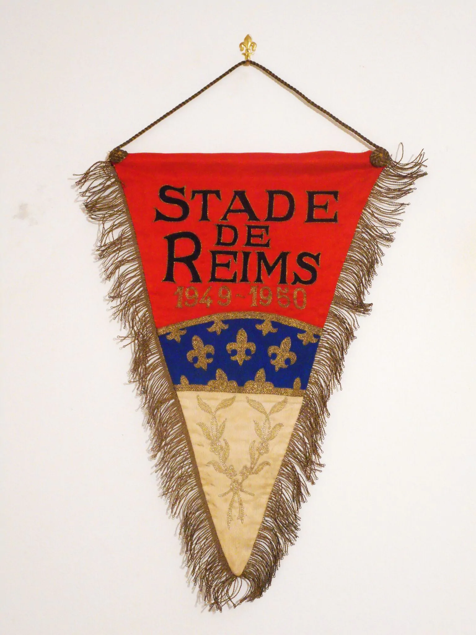 I gagliardetti del Reims in quel periodo, almeno fino alle innovazioni che subentrarono negli anni Cinquanta, erano realizzati con fattezze similari: dimensioni non generose, ricamo della denominazione societaria abbinato ad uno “scorcio” dello stemma cittadino in cui compare, tra gli altri, uno dei simboli per eccellenza della Francia ovvero i gigli d’Angiò in campo azzurro. Il tutto accompagnato dai colori bianco e rosso, tonalità che hanno caratterizzato le gesta di questa squadra sugli stadi d’Europa e di Francia.