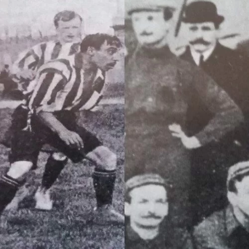 Domenico Donna e James Squair, due elementi di punta della formazione juventina che, sotto la presidenza di Alfred Dick, vinse il campionato nel 1905. I due giocatori juventini sono qui marcati da Etienne Bugnion e Edoardo Pasteur. (Foto archivio Fondazione Genoa)