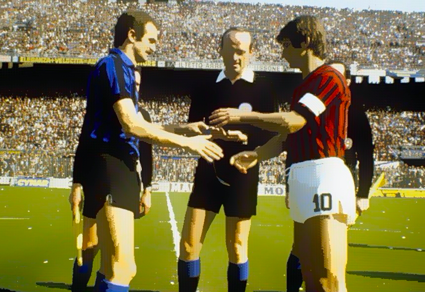 […] Per oltre dieci anni Milan-Inter fu anche, e soprattutto, Rivera contro Mazzola. Dall’esordio di Rivera si dovettero attendere quasi tre anni per vedere i due per la prima volta in campo contemporaneamente: la «prima» di Sandrino, non ancora Baffo, è condita da un gol di ottima fattura. Da quel momento Milano e l’intera Italia calcistica si spaccano: chi è per l’uno, deve essere per forza contro l’altro: il calcio atletico contro il calcio pensato. La sfida personale fa cassetta, i dualismi fanno sempre bene allo sport, sin dai tempi di Binda e Guerra.