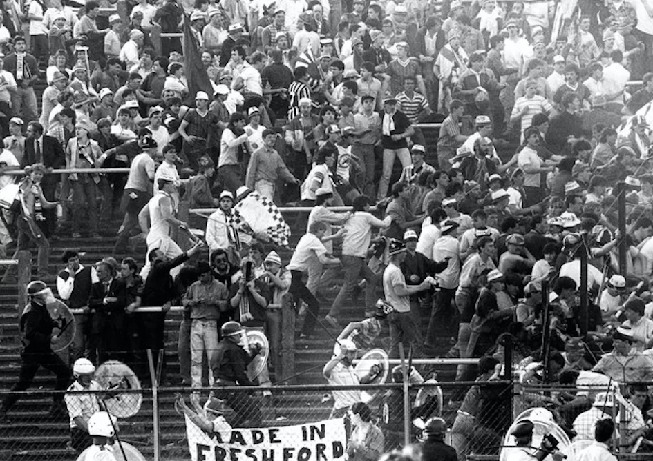 […] Nel frattempo l’hooliganismo aveva assunto i connotati di una spiacevole “disease”che raggiunse il picco nel 1985, annus horribilis del calcio inglese. […] A maggio fu la volta del rogo di Bradford in uno stadio privo di estintori per paura che venissero usati come armi, ma soprattutto della strage dell’Heysel, che venne assunta come data spartiacque nella storia dell’hooliganismo e dalla quale nacquero tutte le successive leggi in materia.