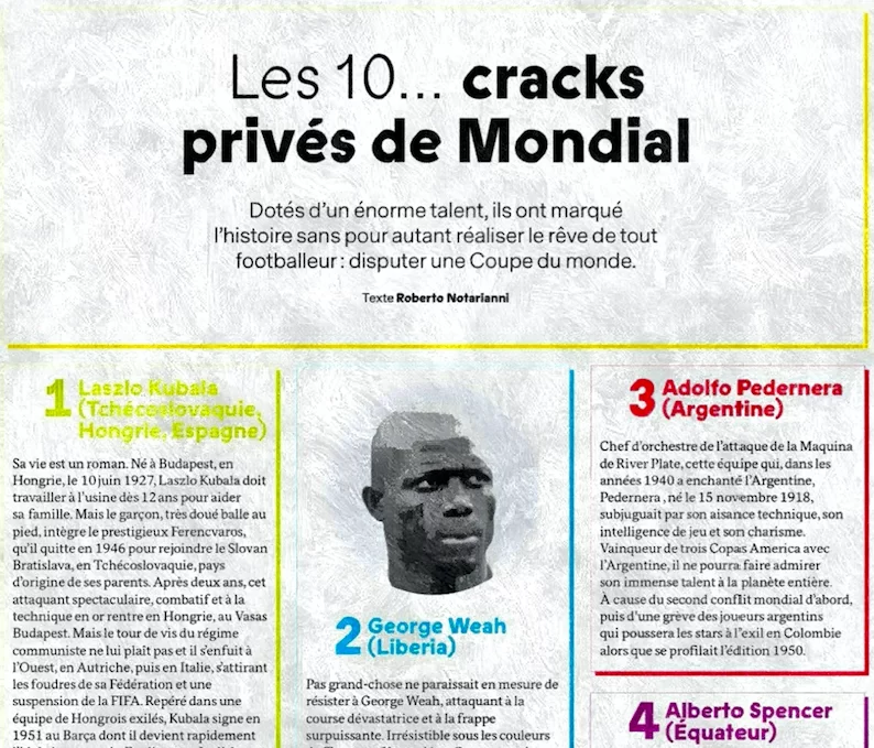 France Football, nell’ultimo numero, ha stilato una classifica dei talenti che non hanno mai avuto l’onore di partecipare alla massima competizione per squadre. Mancano talenti assoluti come Cassano, ma ci sono veri mostri sacri del calcio di ogni epoca.