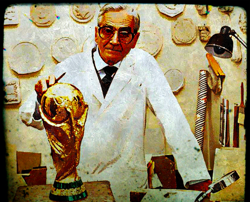 […] Il trofeo calcistico più ambito del pianeta compie cinquant’anni. È la «milanese» Coppa del Mondo Fifa, ideata e realizzata dallo scultore Silvio Gazzaniga (1921-2016), fra l’agosto ed il settembre del 1971 nel laboratorio di via Volta (a due passi dall’Accademia di Brera). È il trofeo di chi vince il Mondiale, dalla presentazione ufficiale sul bollettino della Fifa nel gennaio del ‘72. Due atleti stilizzati che, esultando, sorreggono il globo (6,175 kg su 36,8 centimetri di altezza). «Mio padre — racconta Giorgio Gazzaniga — veniva anche da opere religiose. Volle così stilizzare in quella statuetta, simboli che richiamassero la fede e proponessero linee riconoscibili in ogni parte del pianeta. Oggi tutto il lavoro svolto in preparazione di quel trofeo è riunito nel nostro deposito-museo, dove sono custoditi disegni, calchi e prime versioni in gesso. E quella prima copia in cera d’api, dipinta di rosso, che fu inviata in Svizzera. Per partecipare al concorso voluto dalla Fifa per sostituire la Coppa Rimet».