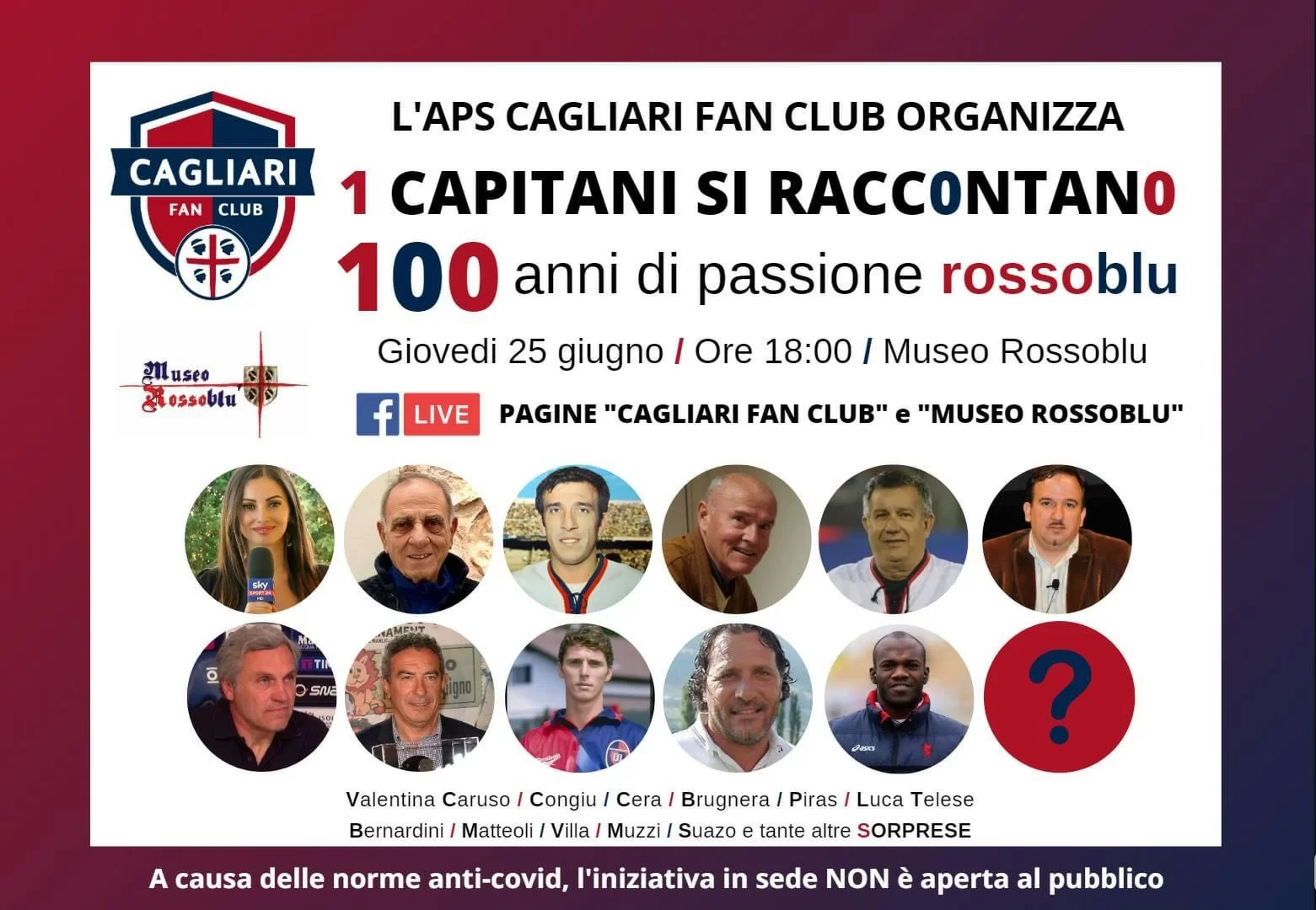 GLIEROIDELCALCIO.COM – Oggi 25 giugno dalle ore 18:00, in diretta sulle pagine di Cagliari Fan Club e Museo Rossoblù, l’iniziativa “I Capitani si raccontano”, organizzata dall’APS Cagliari Fan Club, è stata pensata e organizzata nell’ambito delle celebrazioni per i 100 anni del Cagliari Calcio.