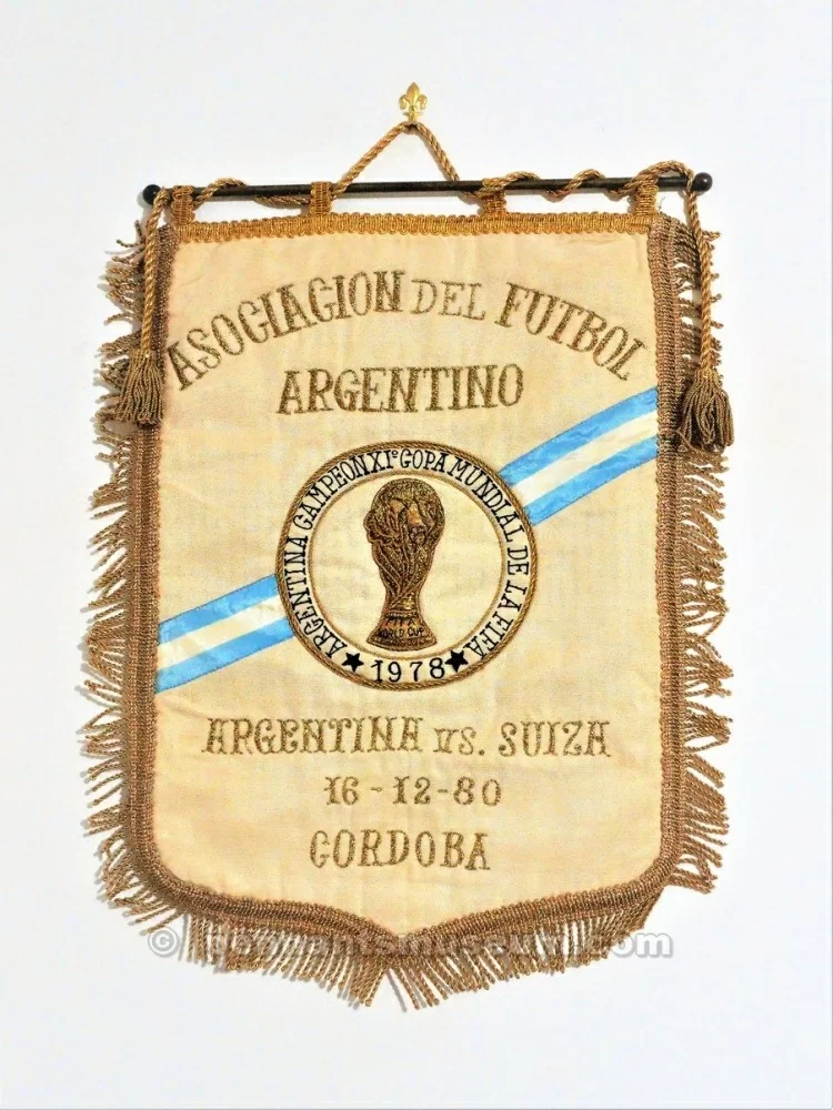 PENNANTSMUSEUM.COM – Alla fine degli anni ottanta, il 16 dicembre, i campioni del mondo dell’Argentina si apprestano ad iniziare l’avventura nella Coppa d’oro dei Campioni del Mondo che molti ricorderanno meglio con la denominazione di “Mundialito” un torneo ad inviti organizzato in Uruguay a cui parteciparono le squadre nazionali che a quella data vantavano il titolo di campioni del mondo (Uruguay, Argentina, Brasile, Italia, Germania) nonché i vicecampioni del mondo dell’Olanda che sostituirono la nazionale inglese che declinò l’invito a partecipare esteso da parte del comitato organizzatore uruguaiano. Per testare il suo livello di forma l’Argentina giocò un’amichevole contro la Svizzera in quel di Cordoba. Nell’Argentina c’è Diego Armando Maradona che aveva esordito nell’albiceleste nel 1977 all’età di 17 anni quando Luis Menotti lo inserì nel corso dell’amichevole con l’Ungheria. Sebbene non partecipò al mondiale argentino del 1978 Diego, nel 1979, deliziò, con le sue giocate, il mondo ai mondiali U-20 disputati in Giappone e stravinti dall’Argentina.