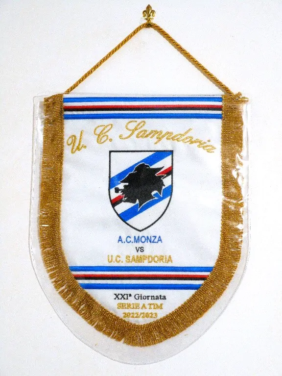La Samp utilizza quest’anno un gagliardetto identico a quello impiegato dalla stagione 2016 – 2017. Quest’ultimo non è nient’altro che l’evoluzione, nel formato, del gagliardetto utilizzato nella stagione 2014 – 2015 di formato triangolare.