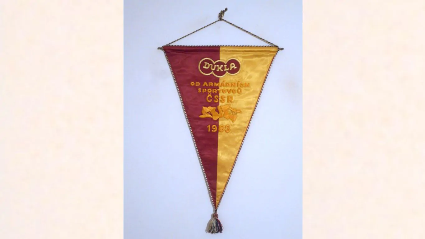 A differenza dei gagliardetti utilizzati nei decenni successivi questo esemplare non riportava il nome Praga, come nell’esemplare nella foto a seguito, che riprendeva l’iconico stemma presente sulle divise da gioco quelle tanto note da diventare un’icona dopo che una band rock inglese (gli Half men Half biscuit) lanciò il surreale motivo “All I want for Christmas is a Dukla Prague away kit”.