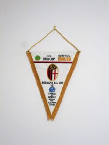 Unica digressione al tema grafico usuale, il gagliardetto in uso nei primi anni Ottanta con uno scorcio del Dall’Ara insieme ai trofei vinti. Alla fine degli anni Novanta i gagliardetti per le competizioni nazionali e internazionali sono di tipo ricamato su sfondo bianco.