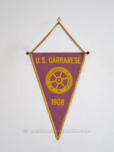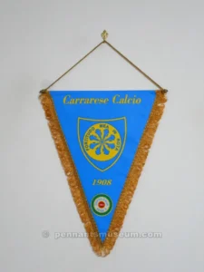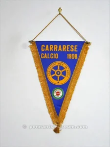 Pietrino Binelli fu un giovane calciatore della Carrarese deceduto a seguito di uno scontro di gioco nel 1930 e il suo nome sarà per decenni abbinato alla denominazione del club. Negli anni novanta i gagliardetti riportano lo stemma caratteristico della città con il relativo motto e sono “arricchiti” dalla coccarda tricolore in ricordo della Coppa Italia di serie C vinta nella stagione 1982 1983.