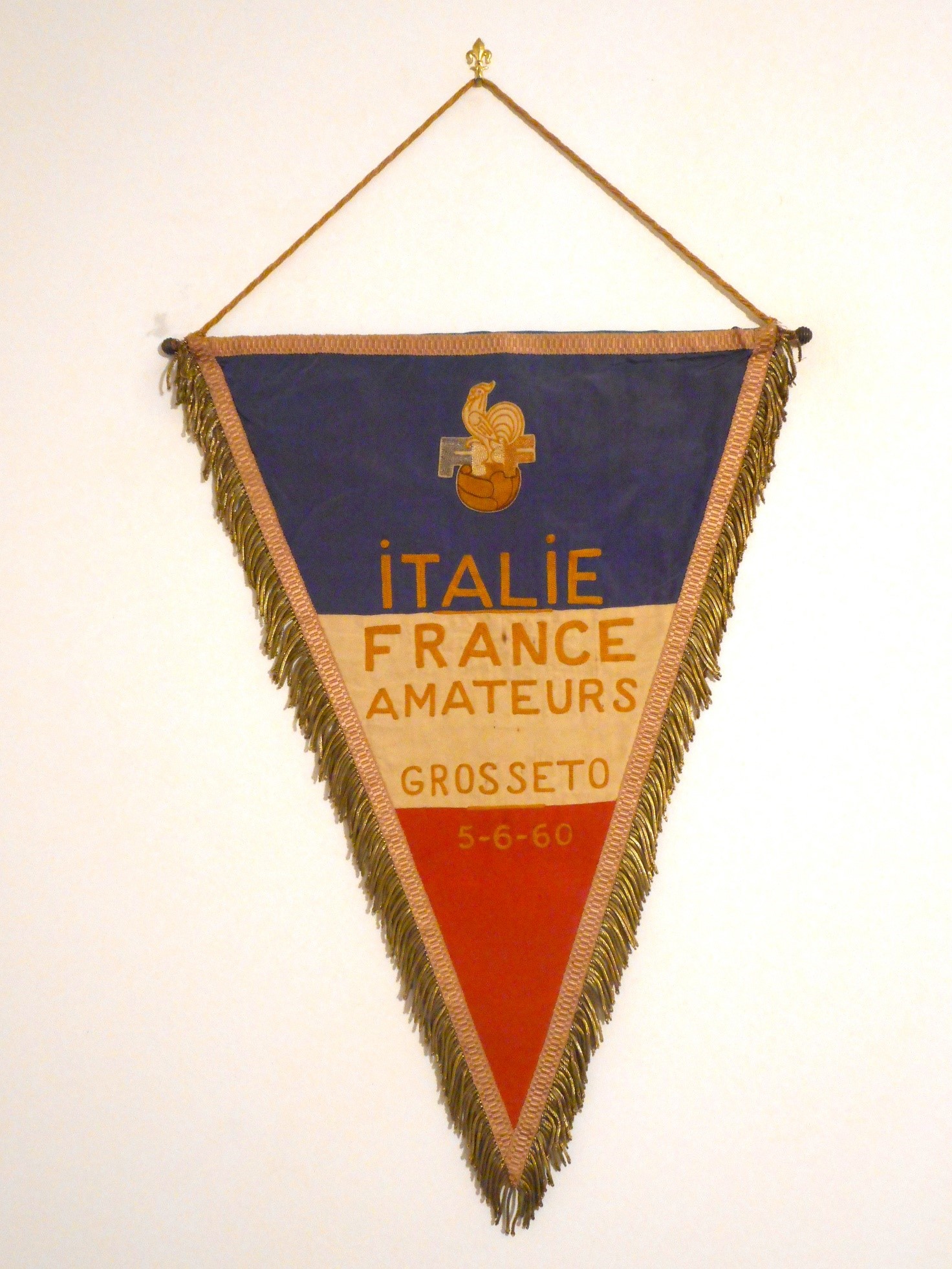 Il gagliardetto era il classico esemplare francese con i colori del vessillo transalpino sulla fronte e lo stemma della federazione calcistica francese rappresentato dall’iconico galletto con le tre F. Sempre in blu il retro a confermare il tradizionale abbinamento cromatico dei gagliardetti transalpini che rimase nel corso degli anni pressoché inalterato.