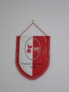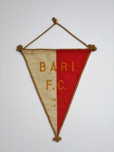 Il galletto, tuttavia, non prese subito piede nei gagliardetti baresi. Nel 1946, probabilmente l’esempio più significativo di un labaro con il gallo. Infatti in occasione della partita Bari – Inter viene realizzato un sontuoso gagliardetto con un ricamo a mano dell’animale e dei dettagli dell’incontro. Una partita particolare di una stagione particolare. L’Italia usciva difatti dalla tragedia della Seconda Guerra Mondiale che aveva disseminato lutti e sconvolto le nostre città riducendole a cumuli di macerie. Per questo motivo la Federazione decise di organizzare il torneo della stagione 1945 – 1946 articolandolo in due raggruppamenti. Il primo era quello di Serie A Alta Italia mentre il secondo la Serie mista A-B Centro Sud, girone in cui era presente il Bari. In quest’ultimo torneo il Bari, che dal 1 gennaio 1945 si era ricostituito assumendo la denominazione A.S. Bari, gioca bene e vince tanto da accedere al girone finale per la conquista del titolo di Campione d’Italia. Alla terza giornata di un torneo costituito da otto squadre, i biancorossi sfidano l’Inter in casa e vengono battuti per 2-1. Quel giorno il capitano barese consegna a quello dell’Inter uno, a mio parere, tra i più bei gagliardetti delle squadre di club nazionali. Il Bari si piazzerà poi in ultima posizione ed il “Grande Torino” divenne Campione d’Italia.