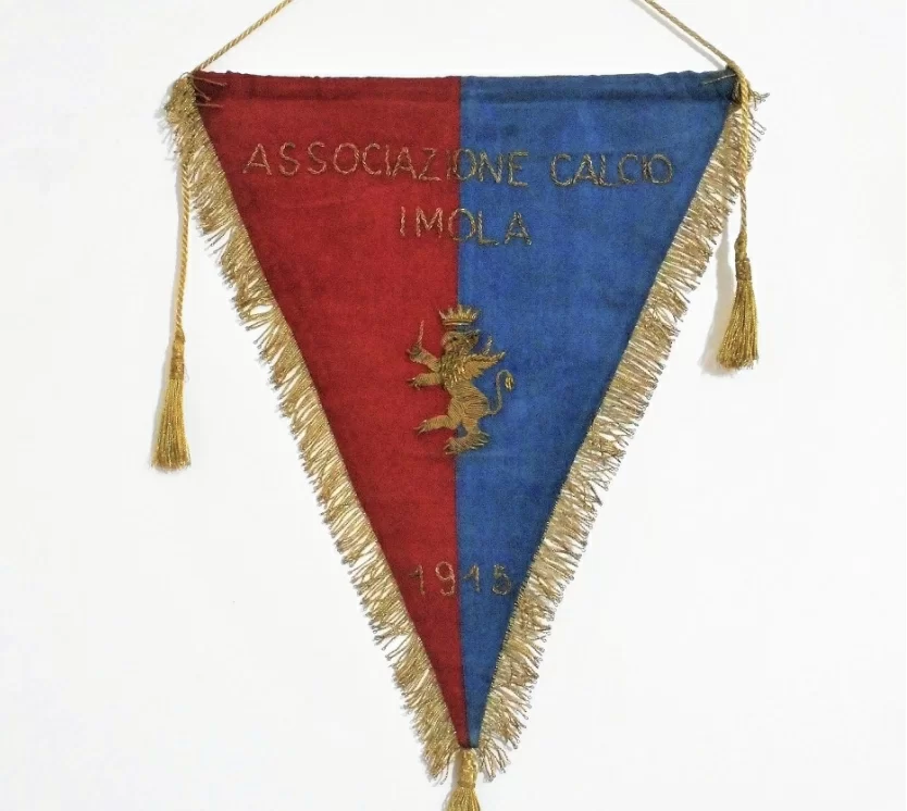 PENNANTSMUSEUM.COM – Il calcio ad Imola nasce dalla ferma volontà del giovane imolese Piero Toschi il quale, dopo aver assistito ad un incontro di calcio, rimase particolarmente affascinato tanto da diffonderne la pratica in città insieme a un gruppo di amici. Terminata la prima guerra mondiale, nel 1919, Toschi con alcuni appassionati fonda l’Imola Football Club assegnando alla compagine i simboli della città ovvero i colori rosso e blu del gonfalone nonché il grifone presente sulle insegne cittadine. Il grifo, animale mitologico, rappresenta i valori di custodia e vigilanza e pronto anche a combattere, come raffigurato con la spada impugnata, per la libertà cittadina. Questo simbolo da sempre accompagna le insegne della squadra e il gagliardetto di questa settimana, risalente agli anni sessanta, ne è un piccolo esempio. Stranamente questo stendardo, con la denominazione Associazione Calcio Imola – in uso a partire dal 1963 fino al 1960 – riporta il 1915 quale anno di costituzione della squadra.