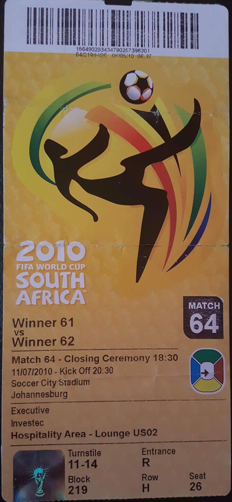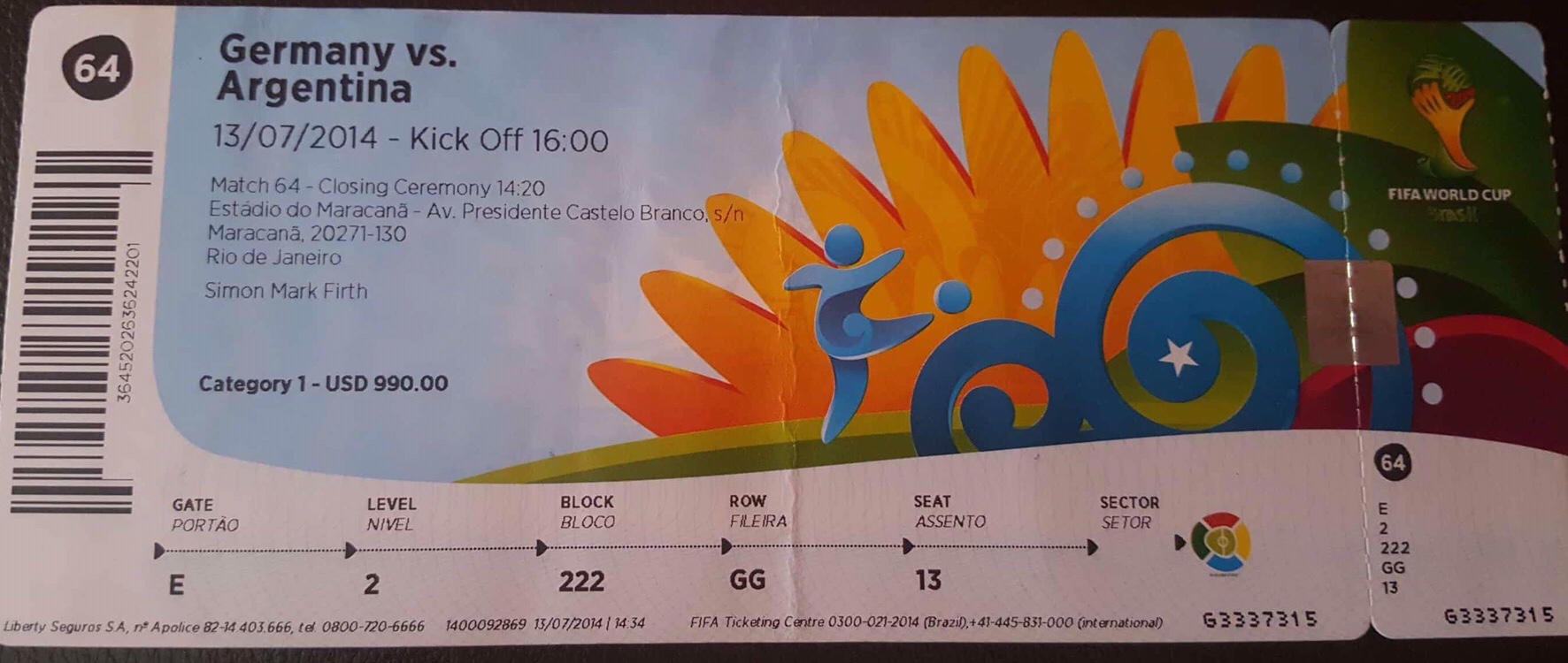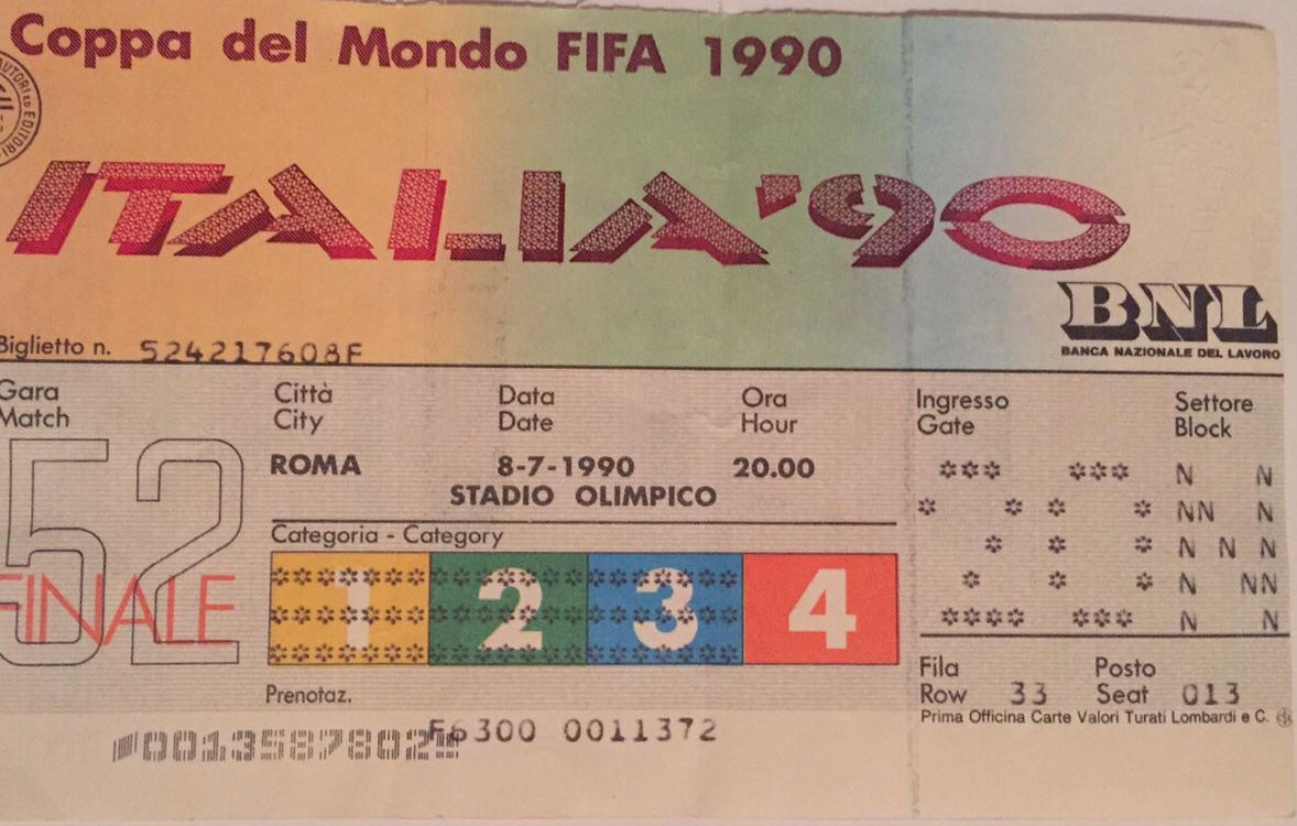 Il biglietto non è uno sforzo di fantasia, tutt’altro, molto simile ad un vecchio biglietto del bus. L’evento a cui si riferisce, la finale di un Mondiale, passa in secondo piano rispetto ai numeri che indicano dove sedersi che, al contrario, risultano essere enormi. Un biglietto pragmatico, dove i disegni colorati geometrici che lo attraversano sembrano un tentativo di renderlo attraente. Conserva comunque un grande fascino.