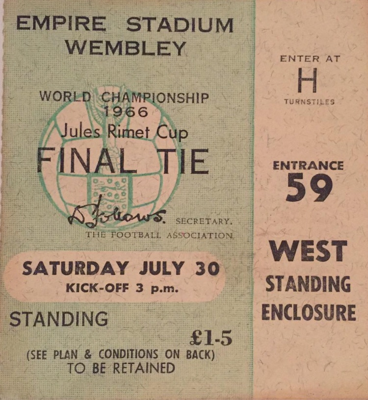 Nel biglietto, un po’ meno serioso dei mondiali cileni, troviamo tutti i dati necessari per l’evento, ma anche dove è il posto in cui ci si deve sedere. Al centro, sotto la scritta “FINAL TIE” si può notare un pallone stilizzato, sembrerebbe proprio il “Challenge 4-Stars” della Slazenger utilizzato in questo mondiale, oltre lo stemma della Federazione calcistica dell’Inghilterra sovrastata dalla Coppa Rimet.