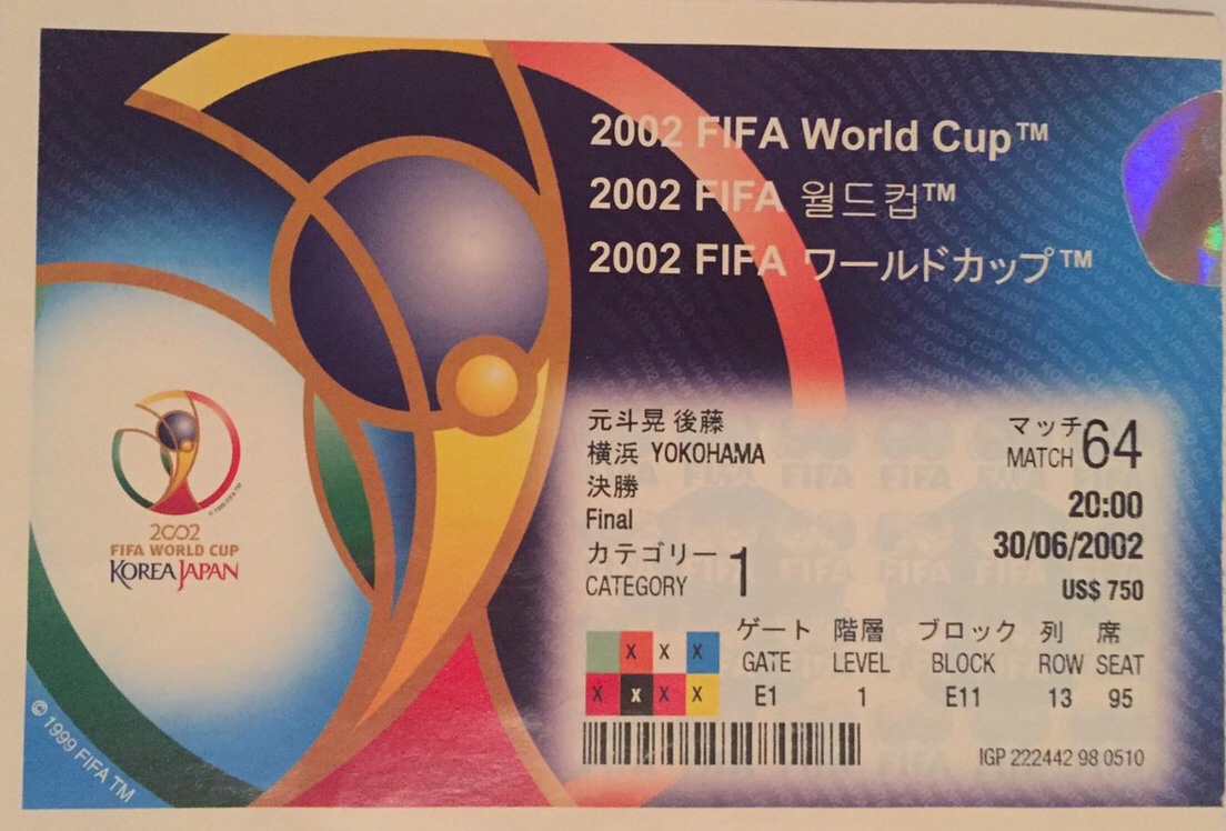 Il biglietto 2002 ha come caratteristica il logo del Mondiale, infatti il disegno è il vero protagonista, tanto dominante da prendere l’intera scena su uno sfondo prettamente blu. L’ologramma è inserito tra il biglietto e il tagliando, metodo molto efficace per smascherare tanti biglietti falsi. Compare il codice a barre.