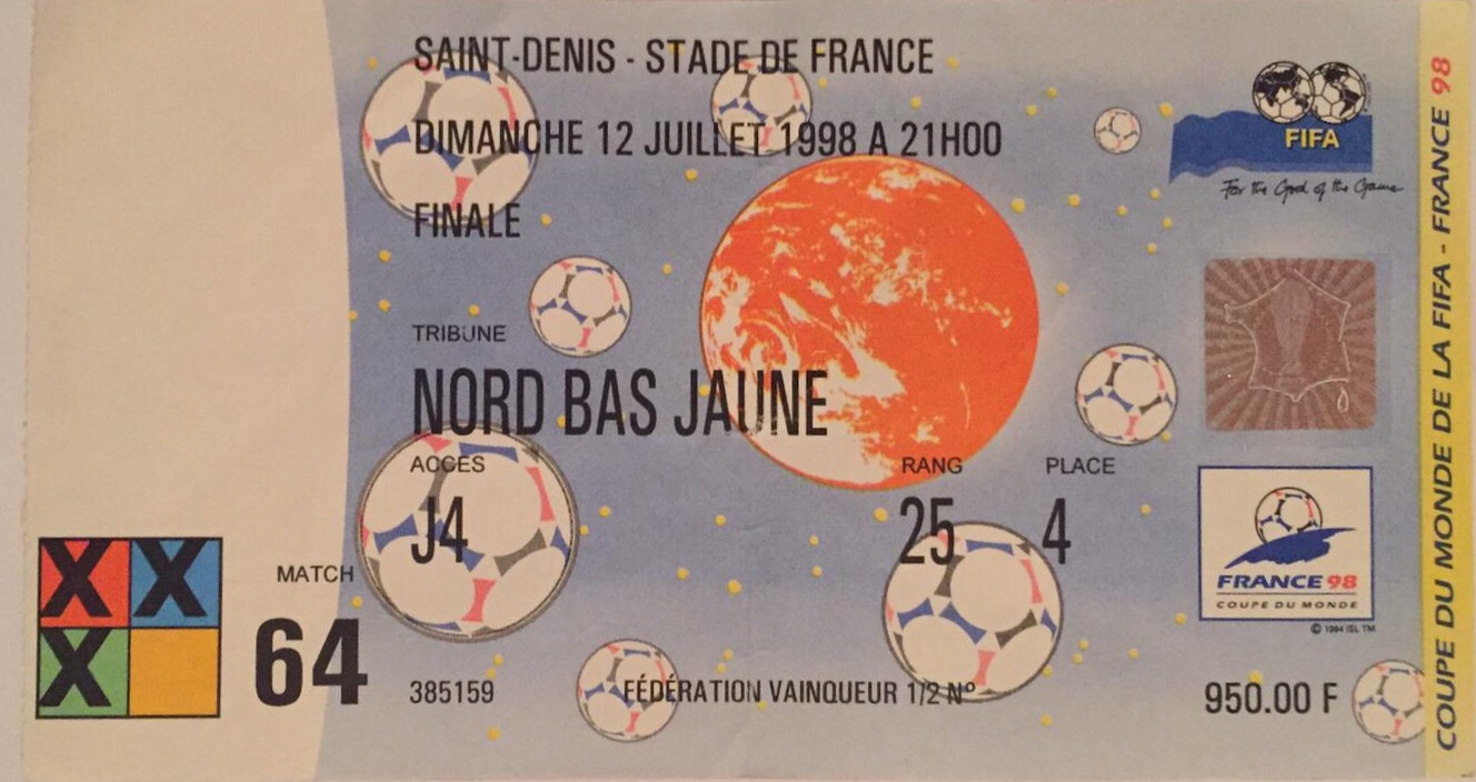 Il biglietto del mondiale transalpino è fondamentalmente un cielo con stelle, pianeti e palloni simili a quello ufficiale chiamato “Tricolore”. Colpisce il colore arancione nella parte centrale, molto vistoso.