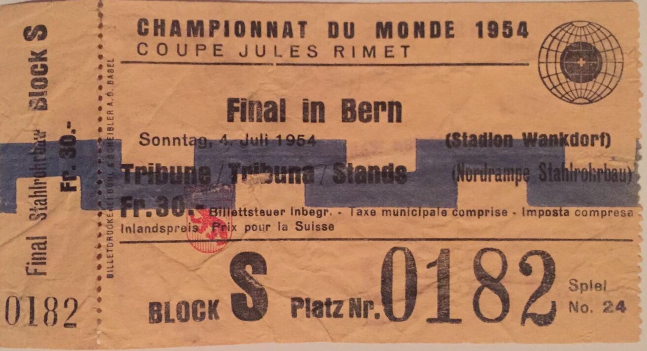 Il biglietto è una sorta di ritorno al passato, più simile ad uno del 1930 che a uno del mondiale precedente. Sulla sinistra il disegno della Coppa Rimet e nessuna indicazione della gara, solo un “Jogo Final” inteso come ultima partita e non come “Finale”. Il timbro delle due squadre è apposto successivamente: del resto è un metodo che sino alla fine degli anni ’80 è stato in voga anche dalle nostre parti.