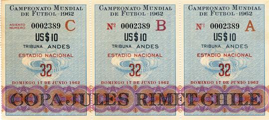 Il biglietto 1962 è molto particolare e suggestivo, la scritta “COPA JULES RIMET CHILE” appare quando i tre tagliandi che compongono il biglietto sono ancora uniti: è davvero molto raro trovarne qualcuno in queste condizioni. Sul biglietto ci sono un pallone e lo Stadio Nacional sovrapposti, il prezzo, il settore e la data dell’incontro. Il tutto in una cornice bianca che insieme ai caratteri scelti per le scritte ne fanno un biglietto “serioso” e importante, molto simile ad un certificato bancario.