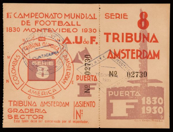 I collezionisti, con tutti i dubbi del caso visto che ci riferiamo a quasi novant’anni fa, considerano il biglietto relativo alla finale del 1930 quello contraddistinto dalla Serie 8. Il tagliando d’ingresso per lo Stadio del Centenario per la partita tra Uruguay e Argentina del 3° luglio 1930, non ha una grafica elaborata, anzi piuttosto semplice, ma è molto “autocelebrativo”. In primis notiamo il riferimento al Centenario della promulgazione della prima Costituzione della Repubblica avvenuta nel 1830, evidente con la scritta “1830 Montevideo 1930”. Al centro notiamo la mappa dello stadio con una freccia che indica il settore a cui si riferisce il biglietto stesso. I settori sono quattro e ognuno dedicato alle imprese compiute dalla nazionale uruguaiana sino a quel momento: