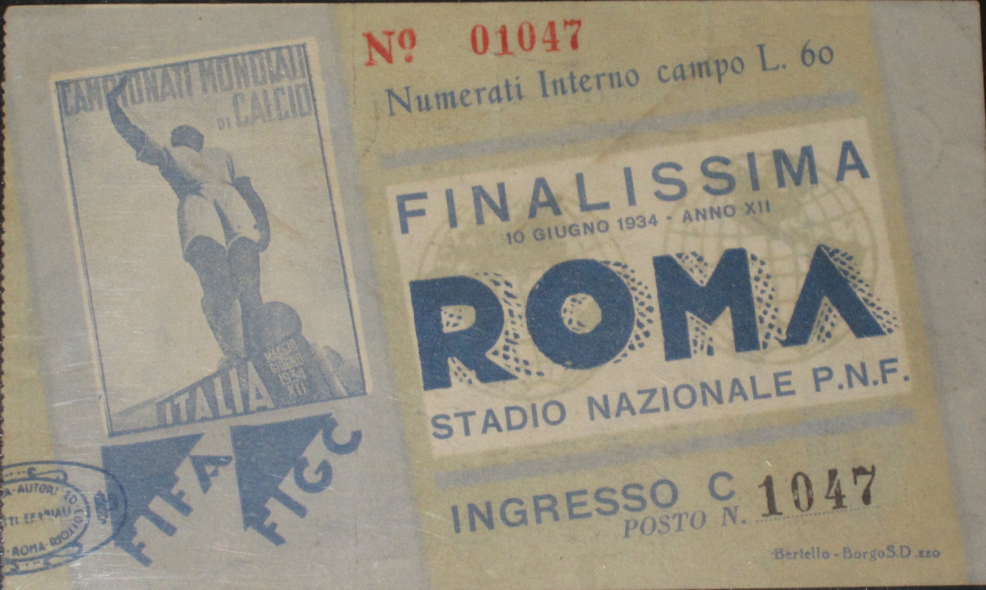 Il biglietto, come tutti quelli di quel periodo e per tanti anni a seguire, è stampato dalla Tipografia Bertello di Borgo San Dalmazzo: mostra un calciatore con il pallone ai piedi nell’atto di effettuare il “saluto romano”; la scritta “Roma”, con effetto 3D potremmo dire oggi, a sottolineare la grandezza della città e dell’Italia. Da notare i tanti “font” tipografici: standard, corsivo, grassetto e calligrafia.