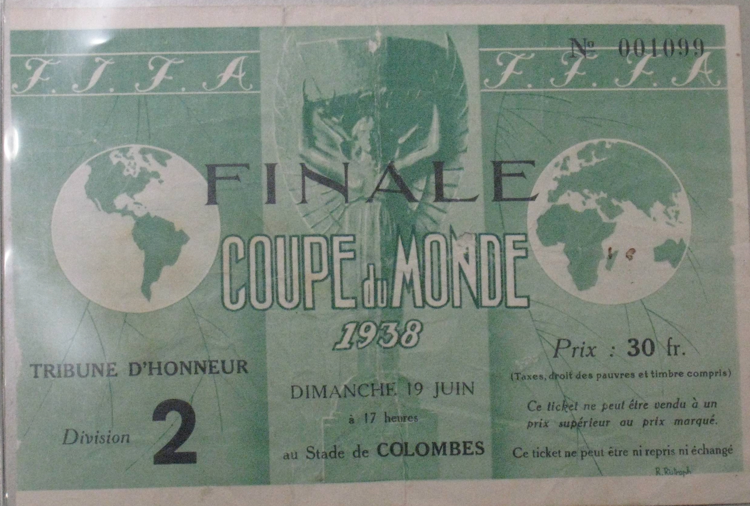 Il biglietto si presenta molto sobrio, quasi elegante: sembra una banconota. Da considerare, visti i tempi, un omaggio a tutti i partecipanti l’inserimento dei due emisferi del mondo con la scritta “FINALE Coupe du Monde 1938” effettuata con stili diversi. Da notare, oltre il nome dello stadio, anche data e ora della finale.