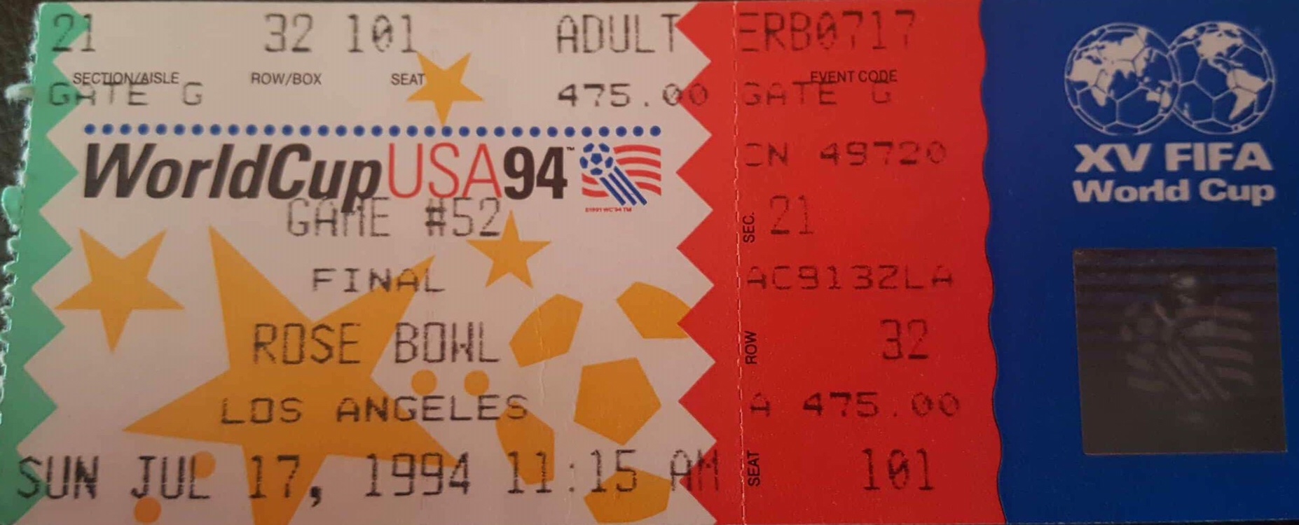 I biglietti del 1994 sono un’esplosione di colori… non solo il rosso, bianco e blu della bandiera Stars and Stripes. Due formati, uno in verticale l’altro orizzontale. Il logo “World Cup USA ’94” è sempre ben evidente e sono usati diversi tipi di carattere. Compare per la prima volta l’ologramma anticontraffazione. Un biglietto di tipica concezione americana, dove si ha la netta sensazione di assistere ad un grande spettacolo già solo avendo il biglietto. Hollywoodiano.