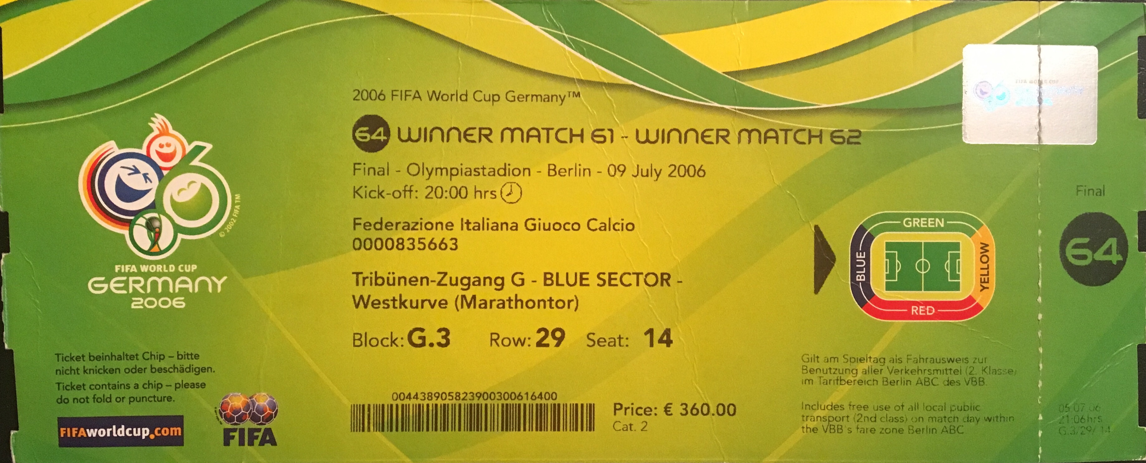 La progettazione del biglietto del 2006 viene fatta su un fondo di varie tonalità di verde, forse a ricordare i campi di calcio o il verde che spesso viene utilizzato dalla federazione tedesca, per esempio sui gagliardetti. Torna il campo stilizzato con l’indicazione dei settori.