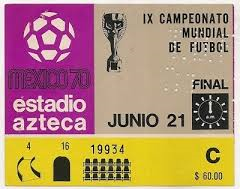 Nel biglietto troviamo il primo logo di un Mondiale e il pallone ufficiale, il Telstar, con i suoi caratteristici pannelli sopra la scritta “MEXICO 70”. Non manca la Coppa Rimet e l’orario è indicato con un orologio analogico dalle forme stilizzate. Il tutto con una scelta cromatica dal forte impatto.