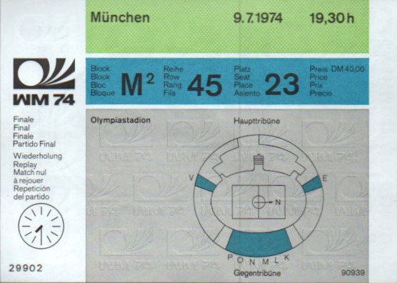 Il biglietto della finale 1974 include il logo, il luogo, la data e l’orario dell’incontro, anche con l’utilizzo di un orologio analogico. Inoltre troviamo un’immagine dello stadio e i settori a cui si riferisce il biglietto in bella evidenza, così come il posto assegnato. Un biglietto senza fronzoli, curato, essenziale, in poche parole molto tedesco.