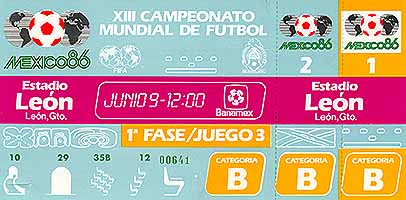 Il biglietto del 1986 è molto simile a quello del mondiale messicano del ’70: scritte molto simili e colori molto accesi. Ancora i due emisferi insieme ad un pallone mentre al centro compaiono data e ora in digitale. Sempre al centro la pubblicità di una nota banca locale, primo caso di pubblicità sui biglietti dei mondiali.