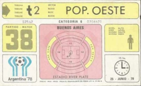 Il biglietto del Mundial argentino è tutto basato sull’indicazione del posto. Al centro la mappa dello stadio con evidenziato il settore, poi in alto i riferimenti. A destra un disegno per indicare se trattasi di posti in piedi o seduti e poi l’orario ancora con un orologio analogico in bella evidenza. Solo a sinistra in basso il logo del Mundial.