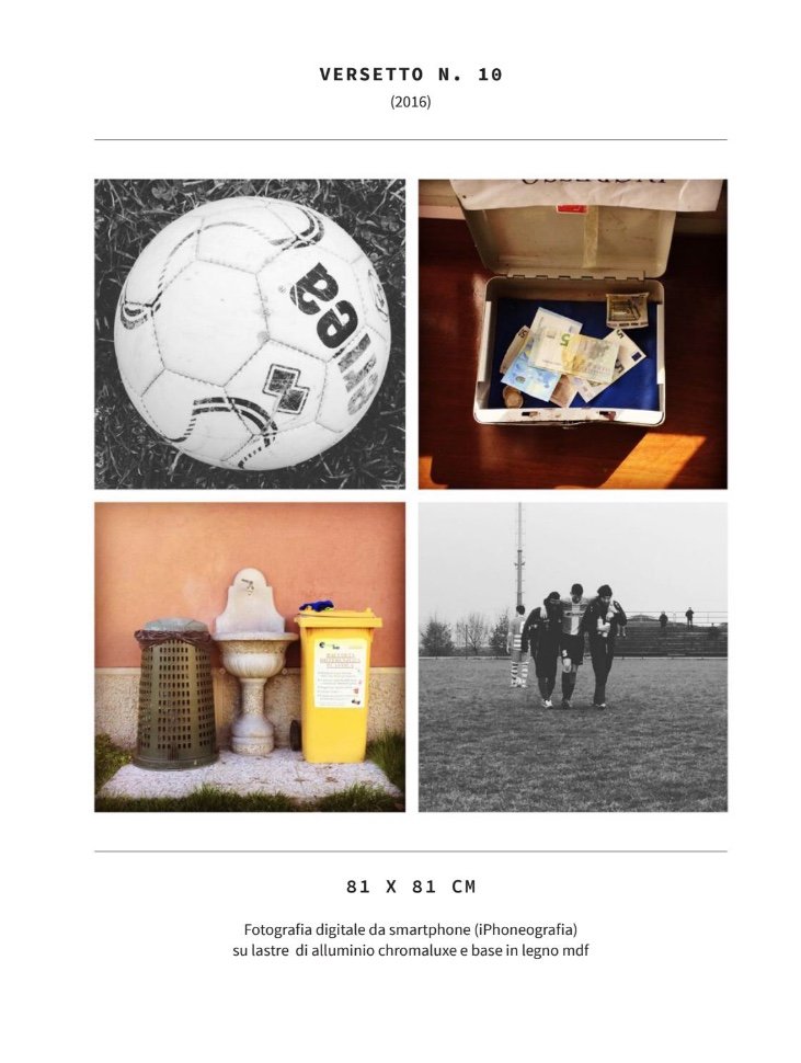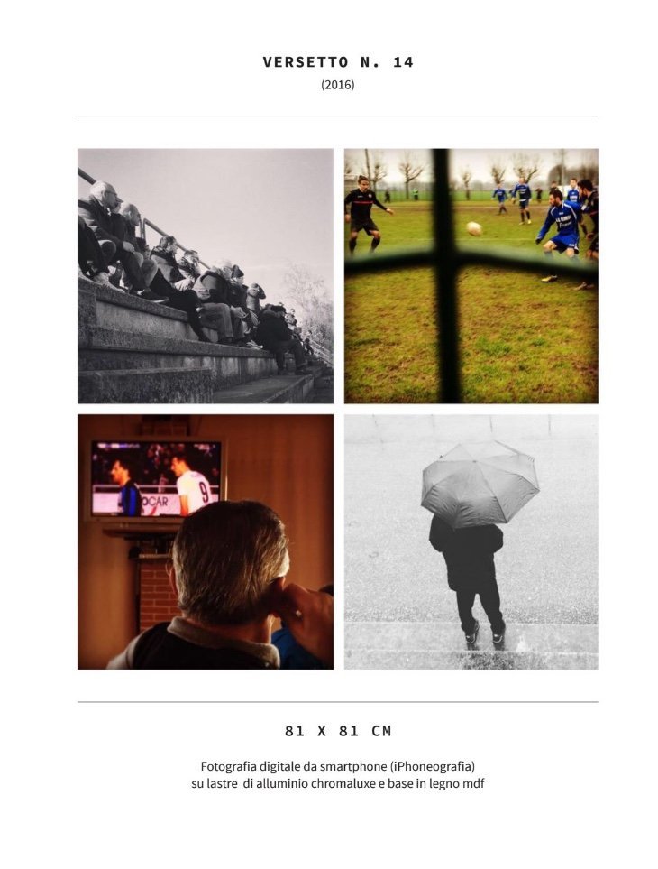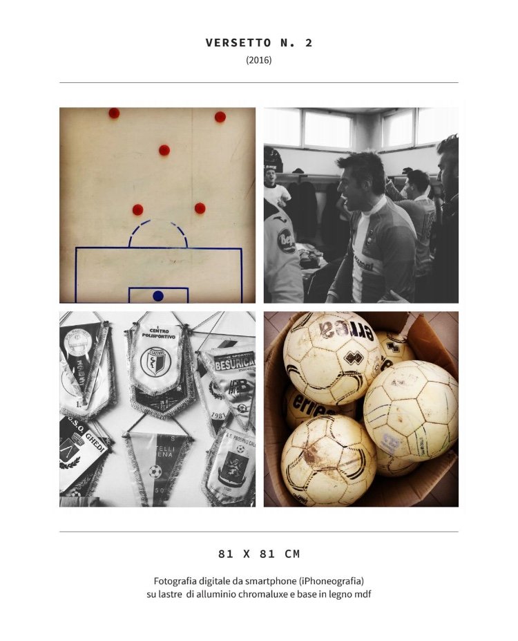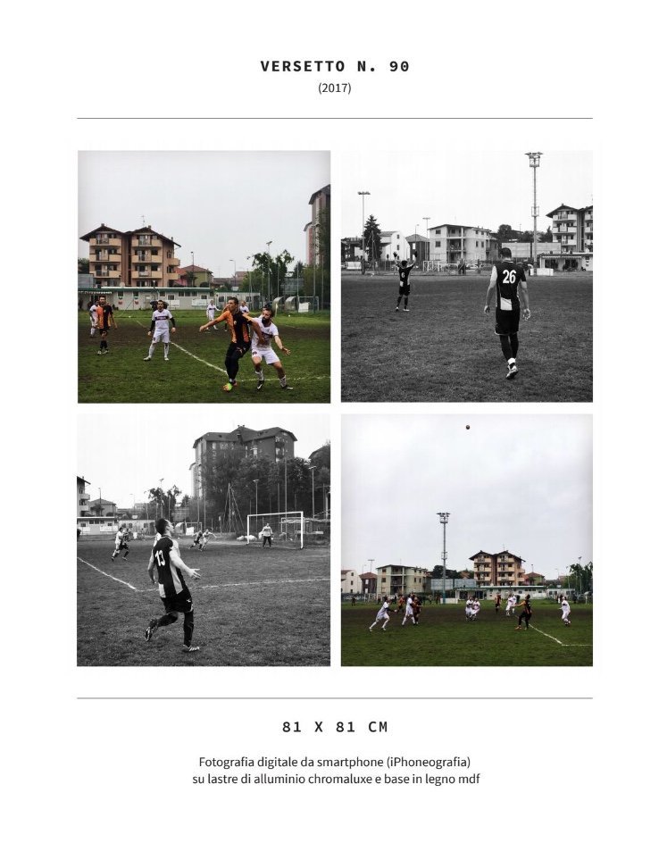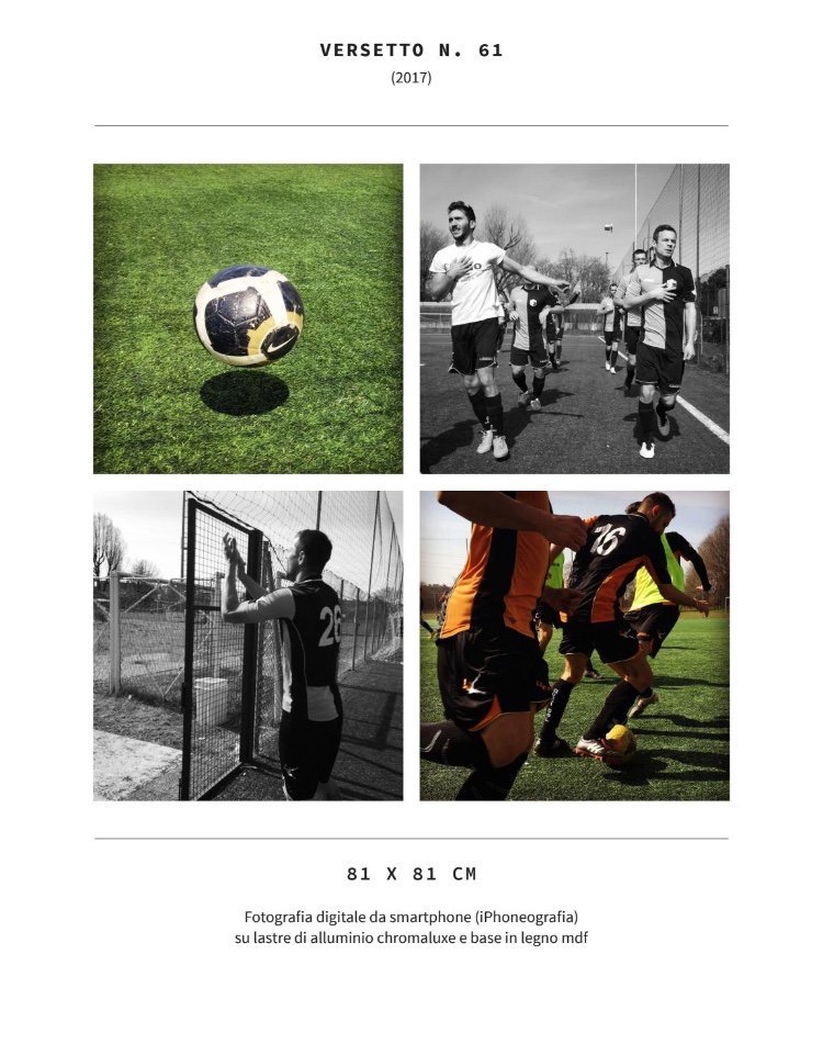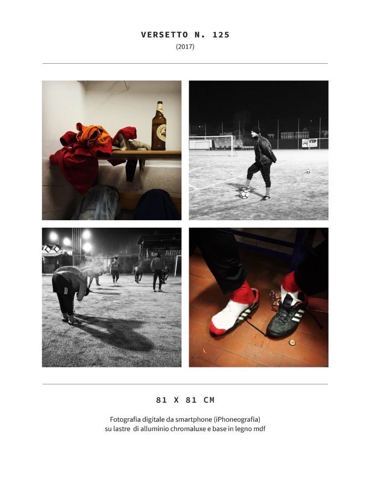 “Ho cercato quindi di riprendere e immortalare i momenti più importanti, più significativi e suggestivi di questo spettacolo chiamato calcio”, continua Nicola, “nei campi di periferia, dove spesso queste squadre rappresentano zone con un vissuto sociale importante, problematico. Sono un concentrato di nazionalità e religioni diverse, abitudini e idee politiche distanti anni luce. Il calcio, nella sua magia, riesce a far superare queste barriere, mettendo insieme anime diverse che mai avrebbero lottato per uno stesso obiettivo in un altro contesto, in un contesto diverso dal calcio. Qui invece si sceglie si stare insieme e ognuno persegue il gol e la vittoria come un riscatto anche sociale. Una vittoria che è lo stare insieme e lottare per un ideale, dove l’allenatore diventa un maestro di vita. Tutto ciò diventa un mondo enorme a disposizione per l’arte. Io sono sempre molto attento quando con il mio iPhone invado gli spazi quali spogliatoi, docce e campi dove si gioca o allenano i ragazzi. Rimango in religioso silenzio, come in chiesa, e rispetto il luogo, il campo. Io ricevo da questi ragazzi e da tutto l’ambiente circostante una grande energia. Faccio circa mille scatti a partita, per fare poi cinque o sei opere composte ognuna da quattro di questi scatti. Creo delle composizioni di contenuto e forma: il contenuto è la verità, il calcio stesso e la forma la costruisco io. Io voglio parlare all’arte con la forma”. Nicola è molto preso dalla conversazione, si sente che è qualcosa in cui crede davvero, è trasportato da questi suoi pensieri.