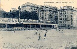 Era un luogo tranquillo, al di fuori del traffico, protetto da 6 palazzi a levante, quattro a ponente, uno a nord ed uno a sud. In quei palazzi abitavano solo famiglie operaie, principalmente ferrovieri ma anche lavoratori siderurgici delle acciaierie Italsider, portuali della Compagnia Unica, operai delle officine meccaniche Ansaldo e qualche marittimo. Queste erano le categorie che rappresentavano quasi esclusivamente gli abitanti dell’isolato ed eccezioni ce n’erano davvero poche. I 6 palazzi dei ferrovieri furono costruiti nel 1919, gli altri edifici circostanti nel 1957. Quindi, ai tempi delle prime partite di football, quell’area era meno edificata e molto più vasta di quanto non lo sia al giorno d’oggi. Era la Piazza d’Armi di Sampierdarena o, ancor meglio, di Campasso. Ma in realtà, più che una piazza vera e propria, era una spianata lunga diverse centinaia di metri e assolutamente priva di edifici. Era chiamata così perchè, a partire dal diciottesimo secolo, era stato un luogo utilizzato per operazioni ed esercitazioni militari. Dopo che il Genoa trasferì nel 1898 il suo campo a Ponte Carrega, in Valbisagno, nella parte opposta della città, la Piazza d’Armi divenne il primo campo della Sampierdarenese. C’è chi nella storia ha sempre il ruolo di apripista e chi, eterno secondo, è destinato a restare nell’ombra ed occupare gli spazi lasciati da altri. Come ricordato in uno striscione in un derby : “ I grandi fanno la storia, gli altri la studiano ”.