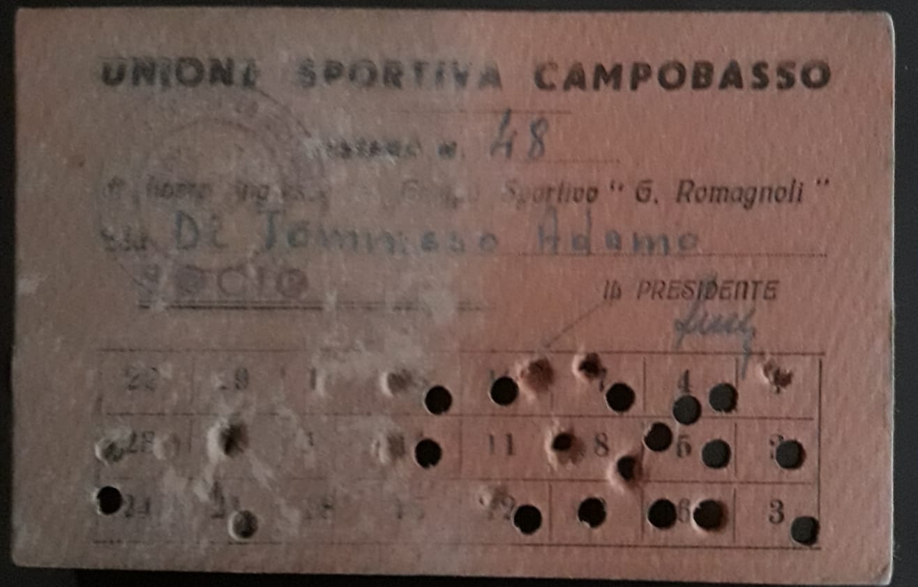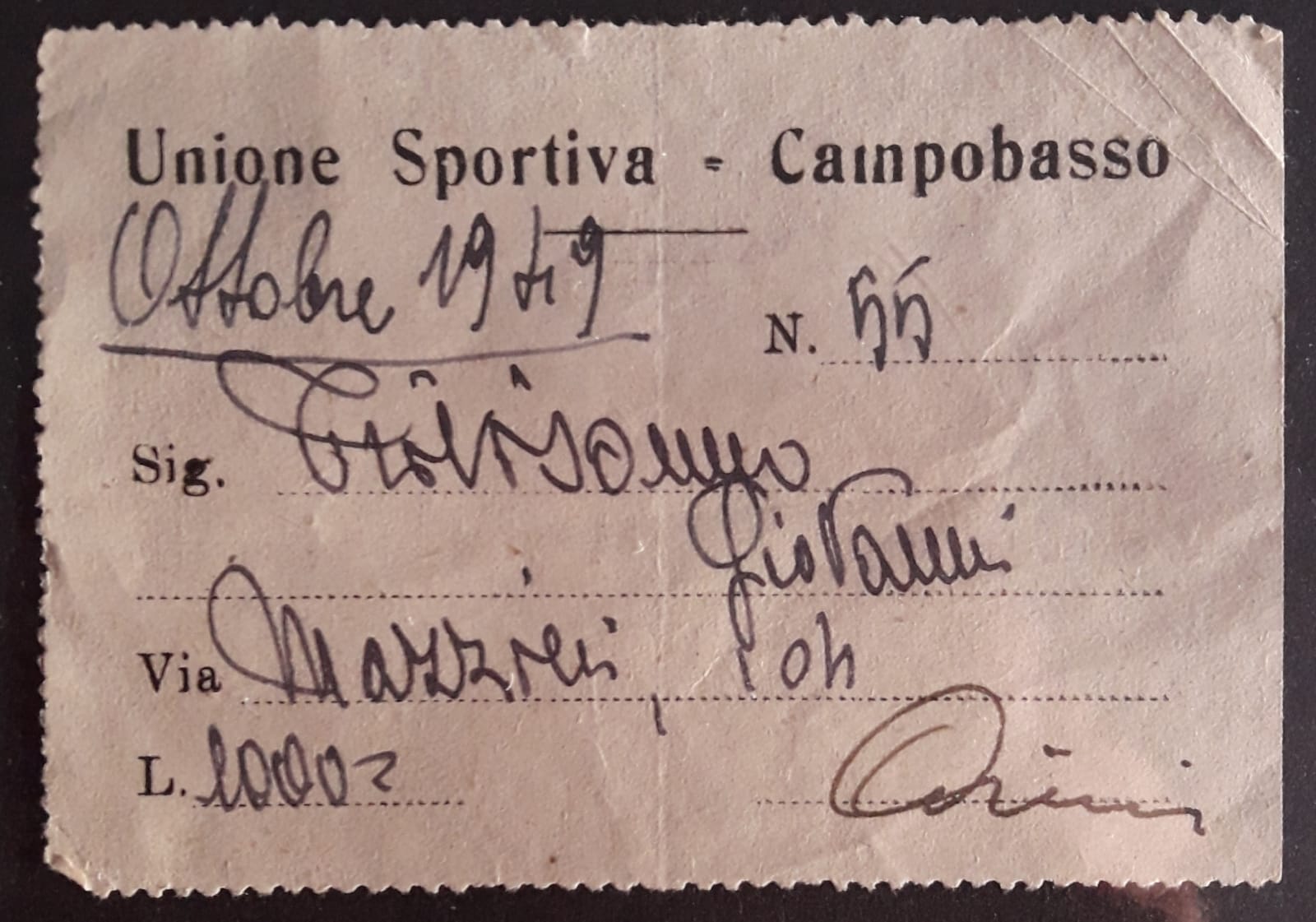 Il nostro amico come sarà diventato un collezionista? La risposta non tarda ad arrivare… “Sono diventato collezionista quasi per caso, conservando gli abbonamenti e i biglietti delle partite a cui assistevo. Con il tempo la passione è cresciuta sempre più; oggi colleziono qualsiasi cosa abbia un legame con il Campobasso Calcio. Sono tanti i “pezzi” che nel tempo ho raccolto, alcuni davvero di difficile reperimento, tra questi sicuramente alcune ricevute di pagamento, datate 1949, per le quote associative versate all’allora U.S. Campobasso, un piccolo trofeo che venne donato ai calciatori in occasione della tournée in Canada nel 1984 e la medaglia F.I.G.C. consegnata ai calciatori per il secondo posto nella finale di Coppa Italia di serie C, vinta dal L.R. Vicenza ai tempi supplementari. C’è un cimelio a cui sono molto legato: 5 giugno 1988, Campobasso-Casertana 1-0, ultima giornata di campionato Serie C, così come buona parte dei ragazzi presenti quel giorno allo stadio, al triplice fischio dell’arbitro, siamo entrati per una invasione pacifica del terreno di gioco. Io mi dirigo verso l’allora stopper rossoblù Carmine Della Pietra, il quale, appena giungo da lui si sfila la maglia n. 5 e la mette sulle mie spalle. Sono letteralmente impazzito”. E chi non lo sarebbe di fronte a un proprio idolo che ti fa regalo del bene più prezioso, la propria maglia.