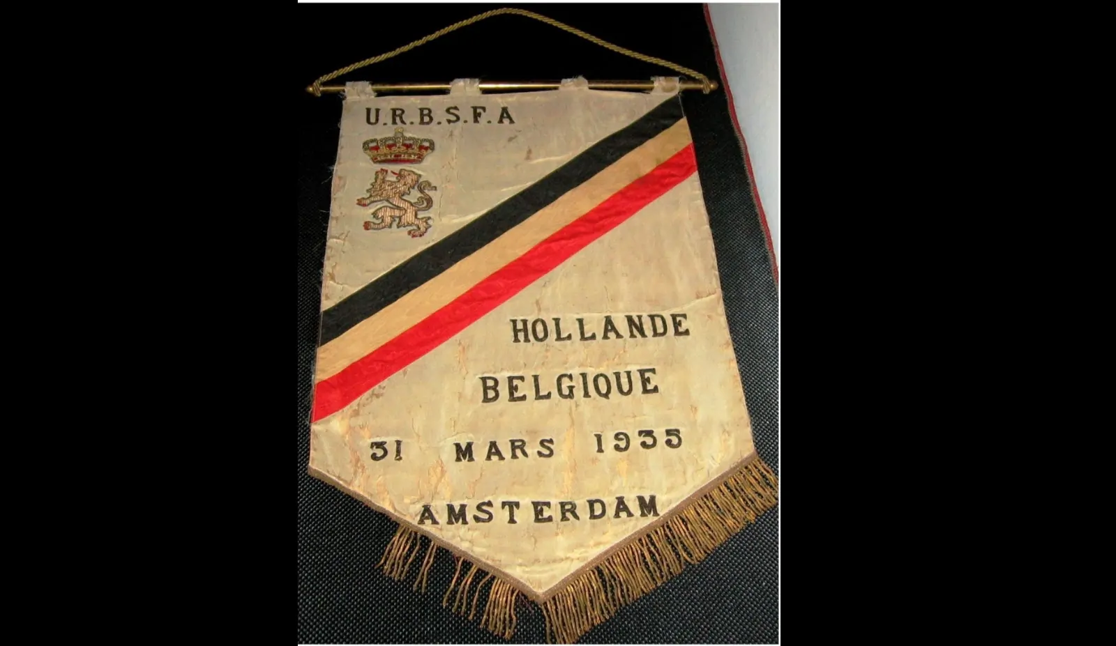L’esemplare di oggi, con i suoi “acciacchi” ed il fascino degli esemplari vintage, estrinseca la totale bellezza dei gagliardetti realizzati tra gli anni Trenta e Quaranta dalla nazionale belga con uno stile inconfondibile caratterizzato dalla fronte del gagliardetto ripartita con una fascia trasversale con i colori della bandiera nazionale belga ed in alto lo stemma.