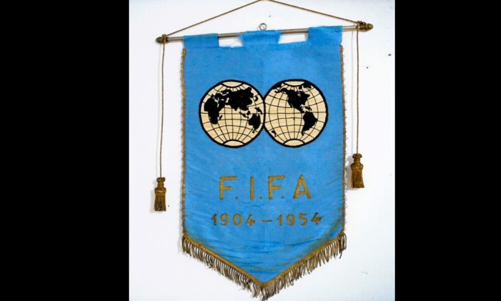 In occasione del cinquantesimo anniversario della sua costituzione, l’organismo che governa il calcio mondiale realizzò dei gagliardetti utilizzando lo stemma che per diversi decenni rimase il simbolo della FIFA. La manifattura, gli accessori nonché l’anello che compare alla metà dell’asta risultano essere familiari all’occhio di un esperto collezionista. Sono infatti gli elementi proposti nei gagliardetti di quell’epoca utilizzati da Torino e dalla Juventus. L’arcano viene svelato sul retro del gagliardetto che riporta l’etichetta di un’azienda torinese la cui bontà nella produzione dei materiali, evidentemente, aveva varcato i confini nazionali tanto da catturare l’attenzione della dirigenza della F.I.F.A. Possiamo pertanto affermare che quell’anniversario fu intriso nel gusto e raffinatezza tipiche dello stile italiano .