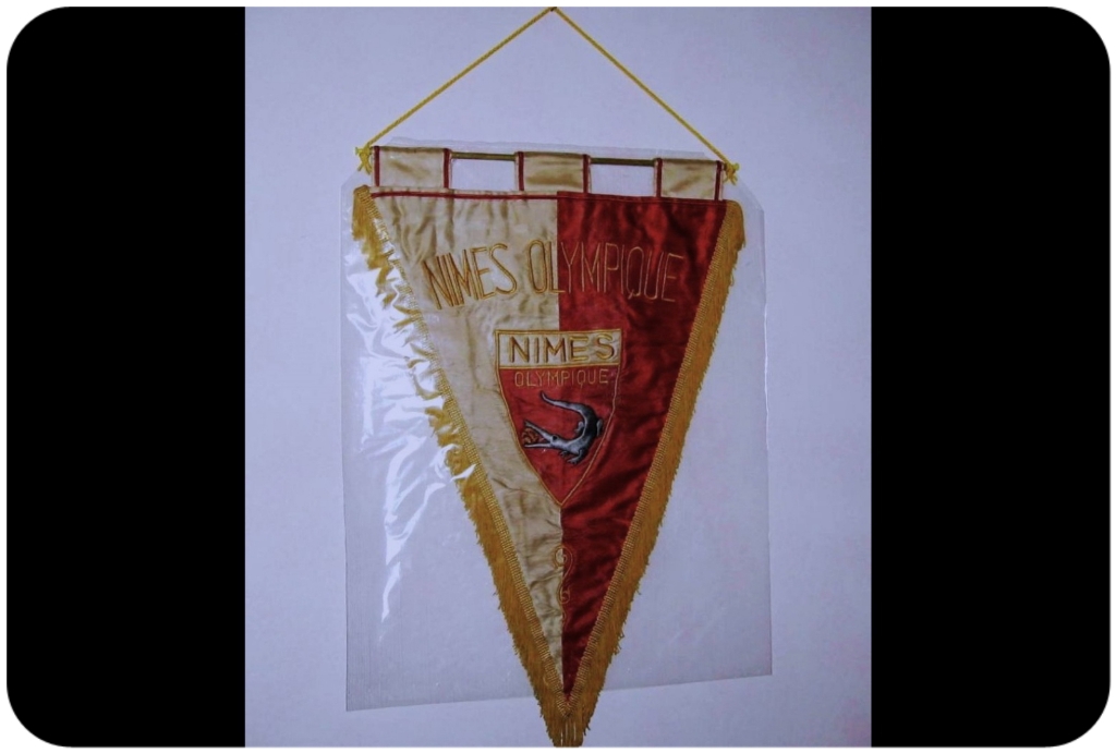 In poche righe questa è la sintesi di un esemplare del Nimes Olympique databile agli anni Sessanta. Sebbene con qualche dettaglio non conforme all’originale (asta, pomelli e cordino)questo esemplare identificata il gagliardetto tipo francese dell’epoca.